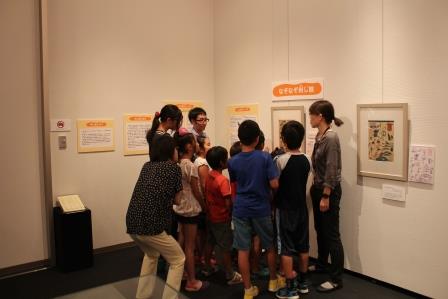 最初に企画展示室に行き、主に江戸~明治時代に作られた判じ絵を見て、ヒントをもらいます。「サクラの花の真ん中がないからサラ」「サカナの下部分がないからサカ」・・・、昔の人の発想力に皆さん驚かれている様子でした。